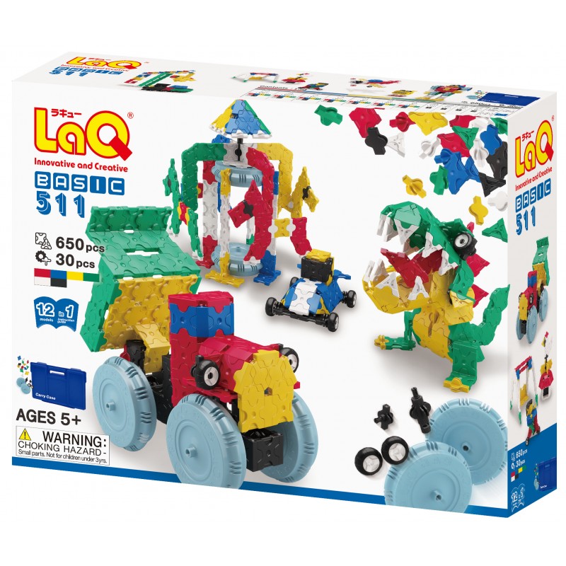 Set de 650 pièces des 7 types de pièces Laq en 6 couleurs classiques (rouge, bleu, jaune, vert, blanc et noir). Avec en plus 30 pièces Hamacron roues et axes. Livré avec un guide spécial et une valisette de rangement bleue.